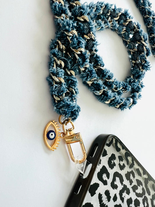 Design: Our denim interlinked crossbody lanyard is all you need this season!